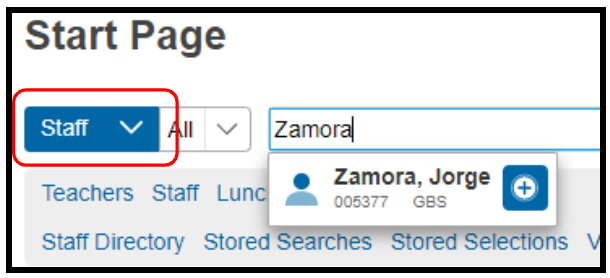 - From the Start Page, search for the staff member. Once found, click on the staff member’s name.