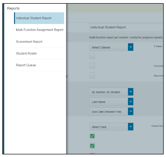 - Individual Student Report: Report for each student listing assignment scores, progress grades, standards grades, and comments.