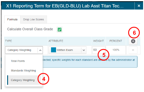 Select Category Weighting ④ (NOT Standards weighting), the category name, and the weight ⑤ for each exam component category.