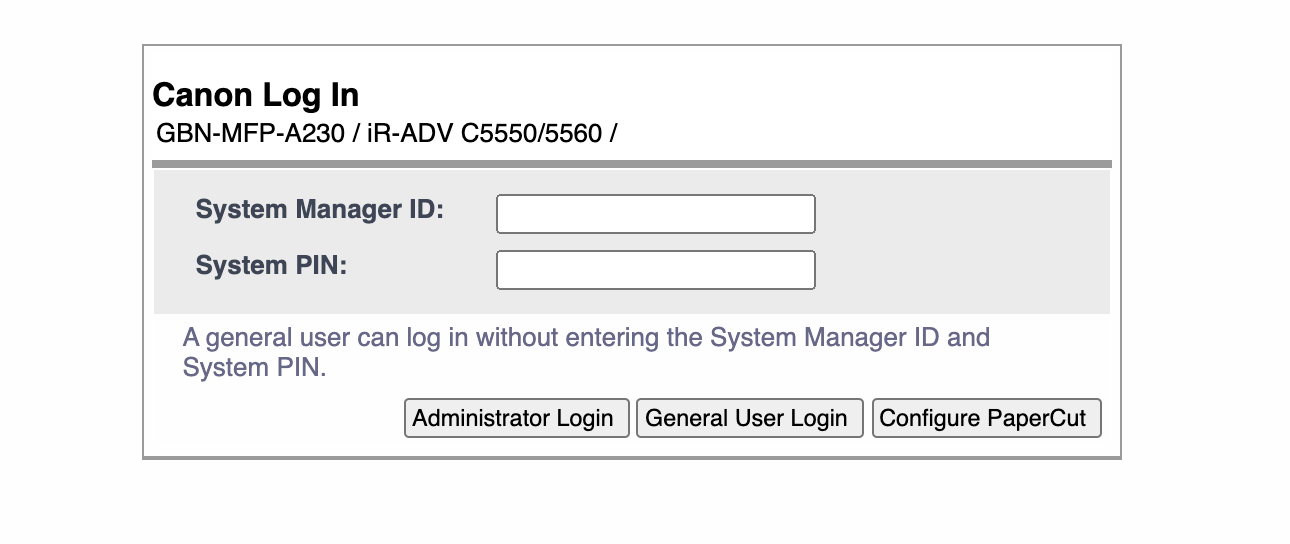 - A copier login window will appear (see picture below). Type in the following credentials. User: 7654321 Password: 7654321