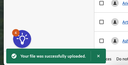 7. If your upload is successful, you'll see a popup in the bottom left hand corner of the URL indicating your file was uploaded successfully. You won't see the number of users assigned in the group increase until you refresh the page. Note: Only users not already on the group list will be added, duplicates are not made of students already listed in the group.