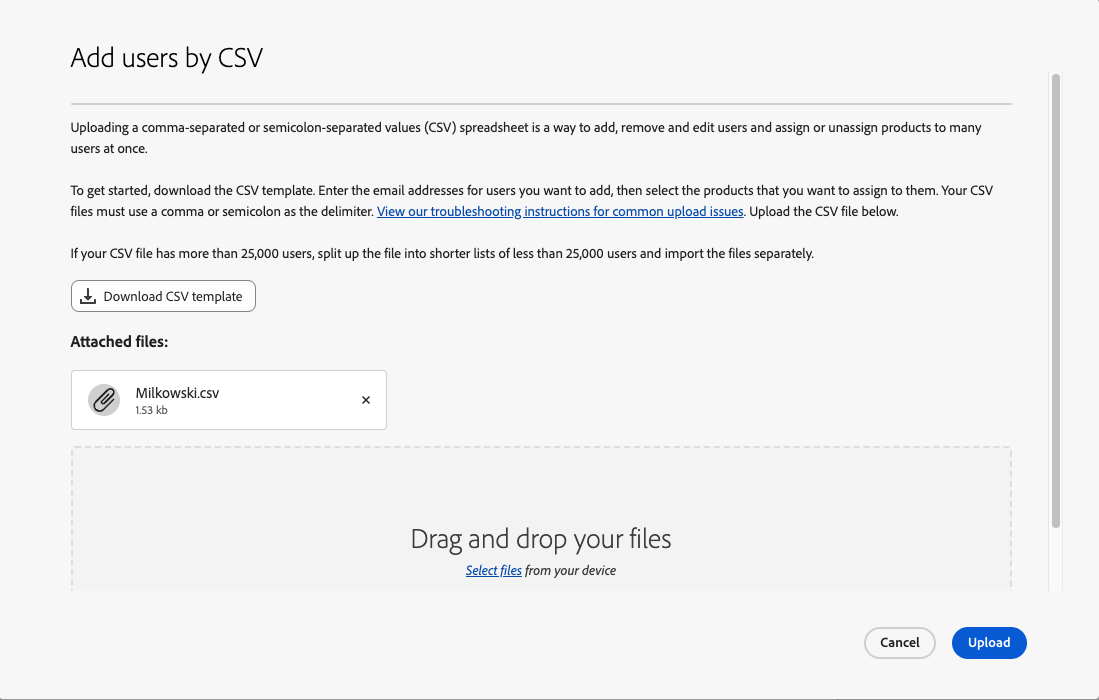 5. Drag and drop your .csv file where indicated on the field that opens. You can also click on the select files link to browse and select the file from your computer.